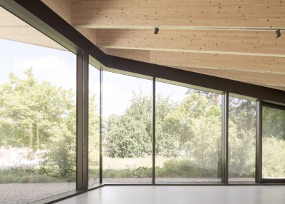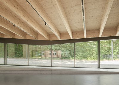 Das Besuchszentrum bietet den Besucher:innen einen Willkommensraum, der offen und transparent gestaltet ist. Der fließende Übergang zwischen Innen und Außen wird auch in der internen Organisation fortgeführt: die Bereiche Showroom, Kassenbereich sowie Informations- und Multifunktionsbereich sind ohne baulich-räumliche Trennung aneinandergereiht und bilden einen Monospace, welcher bewusst auf eine starke Niederschwelligkeit setzt, um Besucher:innen das Gefühl zu vermitteln, einen öffentlichen Garten zu betreten. Sanitärbereiche und Nebenräume sind im Kern untergebracht, welcher organisatorisch sowie statisch als Rückgrat des Gebäudes konzipiert ist. Das Tragwerk überspannt den Innenraum stützenfrei, und ermöglicht - den erhöhten Nutzeranforderungen an Besuchszentrum und Ausstellungsgebäude entsprechend – ein Höchstmaß an räumlich-kuratorischer Variabilität.