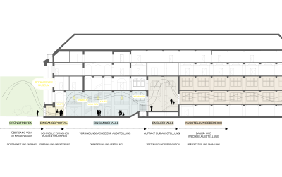 Die jetzige Neukonzeption umfasst den Museumsflügel des Gebäudes mit Eingangshalle, Treppenanlagen und Ausstellungsflächen. Eine neue Museumsachse schafft Orientierung und Neustrukturierung der Erschließung im Gebäude. Diese beginnt in der Eingangshalle, dem zentralen Verteilerraum zwischen Museum, Hörsaalbereich, Bibliothek und Verwaltung, und schafft einen angemessenen Auftakt für den allgemein zugänglichen Ausstellungs- und Vermittlungsbereich des Botanischen Museums. Hier ist die neuen Infrastruktur für Besucher:innen und für Veranstaltungen mit Ticketresen, Garderoben, und zentraler Information geplant. Die Museumsachse führt weiter in die Engler Halle. Diese bildet den Auftakt der Ausstellung und als zentraler und barrierefreier Erschließungspunkt für die Ausstellungsgeschosse. Es ist vorgesehen, die historische, vertikale Raumstruktur wieder herzustellen. Eine neue, skulptural gestaltete Treppe in Rohstahl setzt sich als neues Element bewusst vom Bestand ab und inszeniert die unterschiedlichen Wegeverbindungen von der Eingangshalle bis in den Ausstellungsebenen.