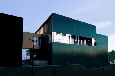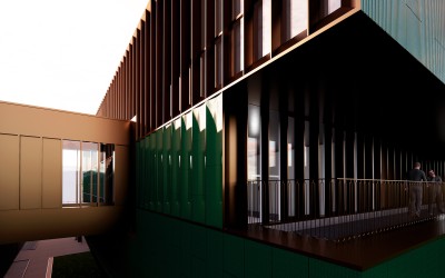 Die künstlerische Gestaltung der äußeren Hülle, eine dunkle Terrakotta-Vorhangfassade mit einer speziell für das ESG entwickelten Glasur, ist dabei eine Hommage an die in Weimar verwurzelte Vereinigung von Kunst, Handwerk und Technik. Durch die Qualität der Glasur und den im Tagesverlauf wechselnden Reflektionen erreicht der einfache, funktionale und elegante Baukörper eine gewisse Maßstabslosigkeit und spiegelt die Funktionalität aber auch die Wertigkeit und den geheimnisvollen Nimbus der Inhalte des EGS wider.