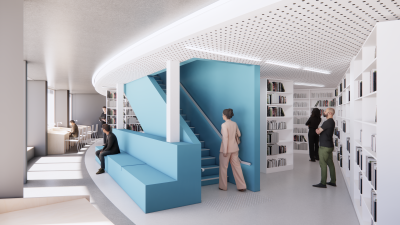 Die neue Architektur des Innenraum gliedert den polymorphen und niedrigen Raum des Bestandsgebäudes und gibt der Bibliothek eine übersichtliche Wegeführung und intuitive Erschließung der Inhalte. Entlang der Fenster liegen die Arbeitsplätze für konzentriertes Arbeiten und Studieren und bilden den Rahmen um die innenliegenden Freihandbereiche. Die zentral liegende Erschließung verbindet Eingang mit Tresen und Zugang zur unteren Ebene der Bibliothek. Der offene und großzügige Eingangsbereich beherbergt verschiedene Funktionen wie den Infotresen, Ausstellung und eine Lesezone. Alle Räume sind barrierefrei zugänglich.
