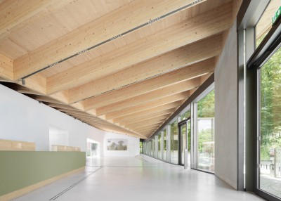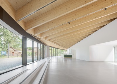 Das Besuchszentrum bietet den Besucher:innen einen Willkommensraum, der offen und transparent gestaltet ist. Der fließende Übergang zwischen Innen und Außen wird auch in der internen Organisation fortgeführt: die Bereiche Showroom, Kassenbereich sowie Informations- und Multifunktionsbereich sind ohne baulich-räumliche Trennung aneinandergereiht und bilden einen Monospace, welcher bewusst auf eine starke Niederschwelligkeit setzt, um Besucher:innen das Gefühl zu vermitteln, einen öffentlichen Garten zu betreten. Sanitärbereiche und Nebenräume sind im Kern untergebracht, welcher organisatorisch sowie statisch als Rückgrat des Gebäudes konzipiert ist. Das Tragwerk überspannt den Innenraum stützenfrei, und ermöglicht - den erhöhten Nutzeranforderungen an Besuchszentrum und Ausstellungsgebäude entsprechend – ein Höchstmaß an räumlich-kuratorischer Variabilität.