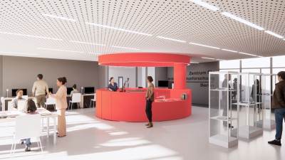 Die neue Architektur des Innenraum gliedert den polymorphen und niedrigen Raum des Bestandsgebäudes und gibt der Bibliothek eine übersichtliche Wegeführung und intuitive Erschließung der Inhalte. Entlang der Fenster liegen die Arbeitsplätze für konzentriertes Arbeiten und Studieren und bilden den Rahmen um die innenliegenden Freihandbereiche. Die zentral liegende Erschließung verbindet Eingang mit Tresen und Zugang zur unteren Ebene der Bibliothek. Der offene und großzügige Eingangsbereich beherbergt verschiedene Funktionen wie den Infotresen, Ausstellung und eine Lesezone. Alle Räume sind barrierefrei zugänglich.
